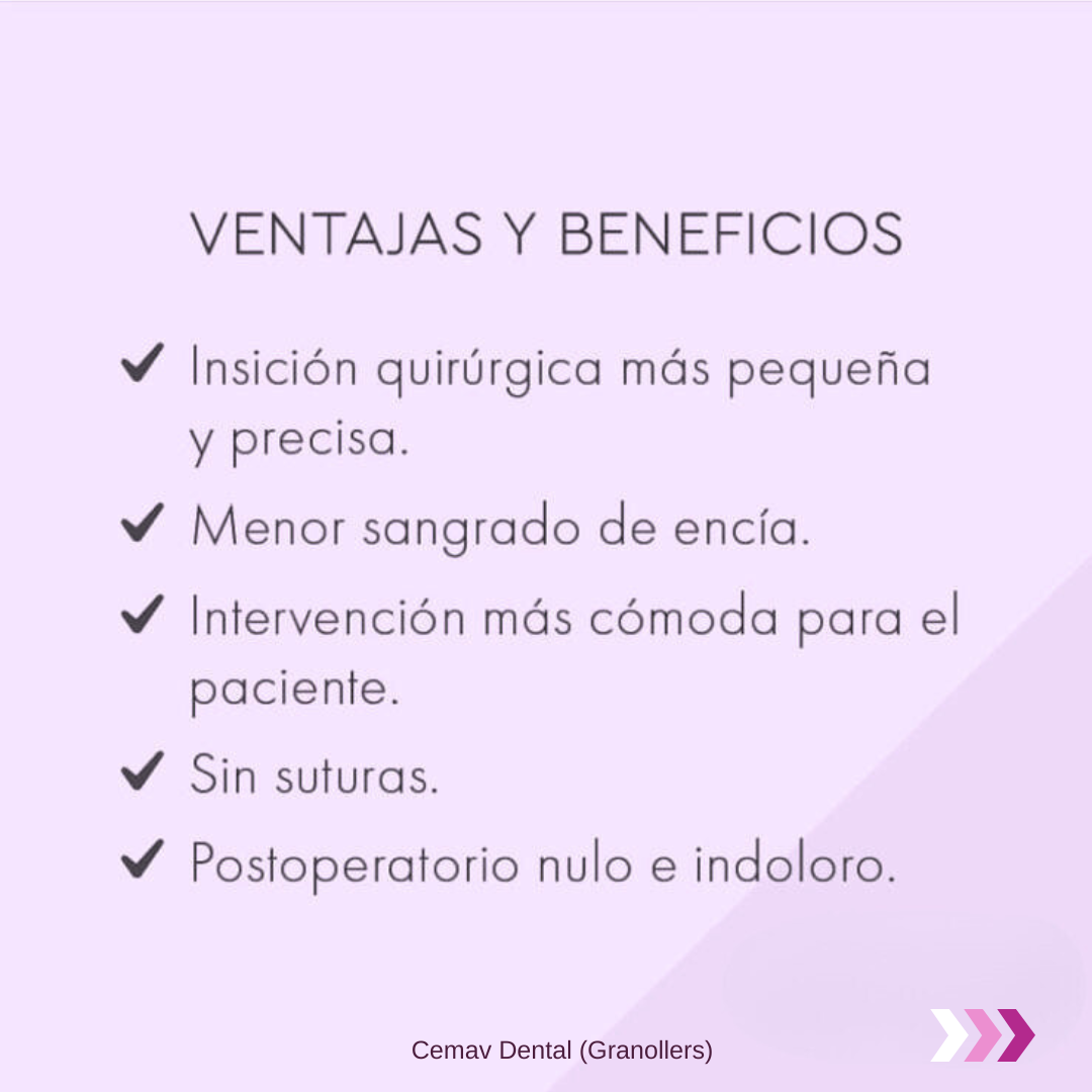 En Cemav Dental, ubicado en el centro de Granollers, ofrecemos un tratamiento innovador y eficaz para quienes sufren de aftas, herpes labial y otras afecciones bucales. Si estás cansado de convivir con las molestias, inflamación y dolor que provocan estas lesiones, nuestro tratamiento con láser dental puede ser la solución que estás buscando. ¿ Qué es el tratamiento con láser dental? El láser dental de baixa potència es una tecnología moderna que se utiliza para tratar los tejidos blandos de la boca de manera rápida, indolora y eficaz. Este tratamiento no solo reduce la inflamación y el dolor desde la primera sesión, sino que también acelera la cicatrización de las lesiones bucales, como aftas e infecciones por herpes labial. ¿ Cuáles son las ventajas del láser dental? El tratamiento con láser dental en Cemav Dental ofrece numerosos beneficios para los pacientes: Rápido alivio del dolor: En la primera sesión, los pacientes notan una mejora significativa en el dolor y la inflamación. Menor tiempo de recuperación: El láser reduce el tiempo de curación de las aftas y herpes en más de la mitad, comparado con tratamientos tradicionales. Totalmente indoloro: Es un procedimiento cómodo y sin dolor, ideal para pacientes que buscan una solución eficaz sin molestias adicionales. Sin tiempo de recuperación: Tras el tratamiento, puedes continuar con tu día a día sin interrupciones. ¿ Cómo funciona el tratamiento? El láser actúa estimulando los tejidos blandos de la cavidad oral, lo que reduce la inflamación, el edema y acelera la cicatrización. Este tratamiento es ideal para personas que sufren de aftas de forma recurrente o tienen episodios frecuentes de herpes labial. Además, no requiere anestesia ni tiempo de recuperación. Uno de nuestros casos más recientes es el de Cristina, una paciente que sufría de aftas y herpes labial con regularidad. Tras recibir el tratamiento con láser, notó alivio inmediato del dolor y, después de dos sesiones, la duración de sus lesiones se redujo drásticamente. ¿ Para quién es este tratamiento? Este tratamiento está indicado para cualquier persona que padezca aftenes, herpes labial u otras afecciones bucales que le causen molestias o dolor. Si has probado otros tratamientos sin éxito, el láser dental puede ser la solución que necesitas. Ven a Cemav Dental y olvídate del dolor En Cemav Dental, estamos comprometidos con ofrecerte los tratamientos más innovadores y eficaces. Si sufres de aftas o herpes labial, no te resignes a convivir con el dolor. Nuestro tratamiento con láser dental puede ayudarte a reducir los síntomas en la mitad del tiempo. Contacta con nosotros hoy mismo y descubre cómo el láser dental puede mejorar tu salud bucodental.